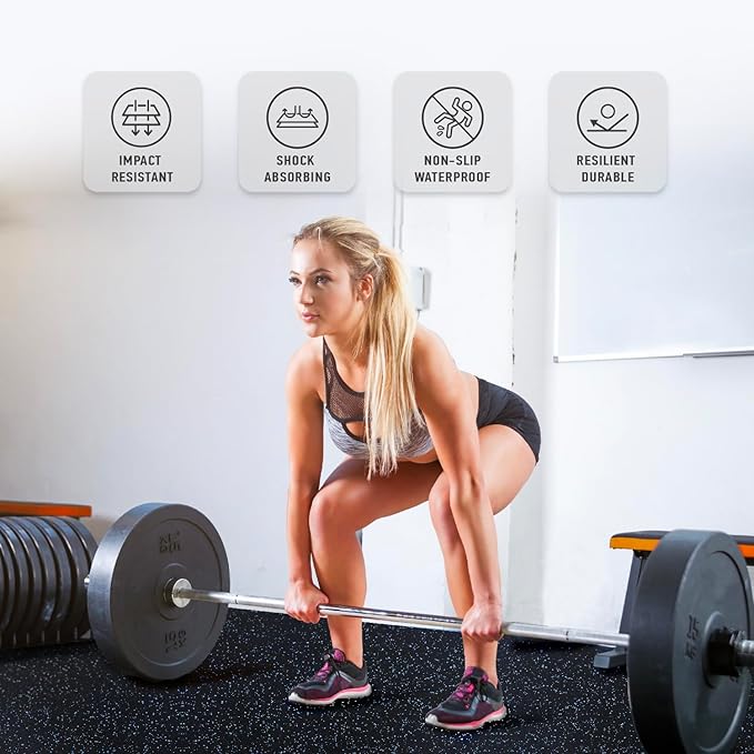 - [Sturdy Rubber Build]: Crafted from premium recycled rubber, our gym mats handle intense workouts with ease. These resilient tiles effortlessly support heavy machinery, providing reliable floor protection against scratches, scuffs, and dents from weights, dumbbells, medicine balls, jump ropes, and other workout gear in a home gym.