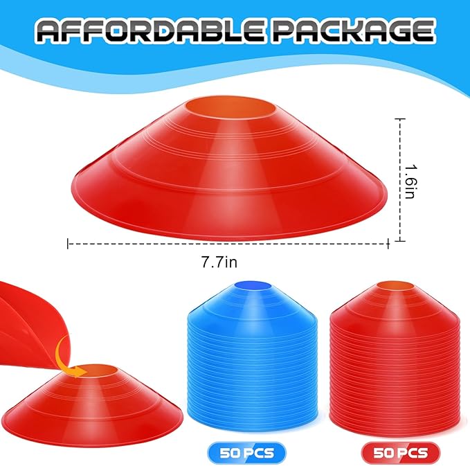 - You Will Receive: 100 mini cones for sports, including 50 in red and 50 in blue, with 1 mesh bag and 1 strap rope, each disc cone 7.7 inches/ 19.56 cm in diameter, 1.6 inches/ 4.01 cm in height