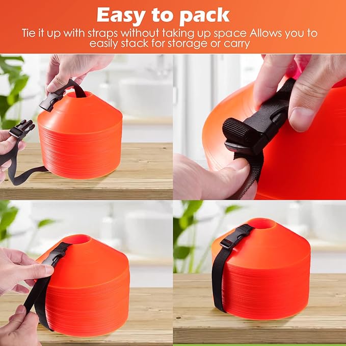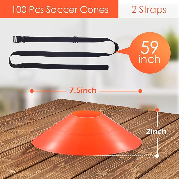 - Cones in Bulk: the set includes 100 orange soccer agility cones with 2 straps measuring about 1.5 meter/ 1.64 yard for each, enough for you and your family and friend to train and play together indoors or outdoors, each soccer agility cone is about 7.5 inches in diameter and 2 inches tall