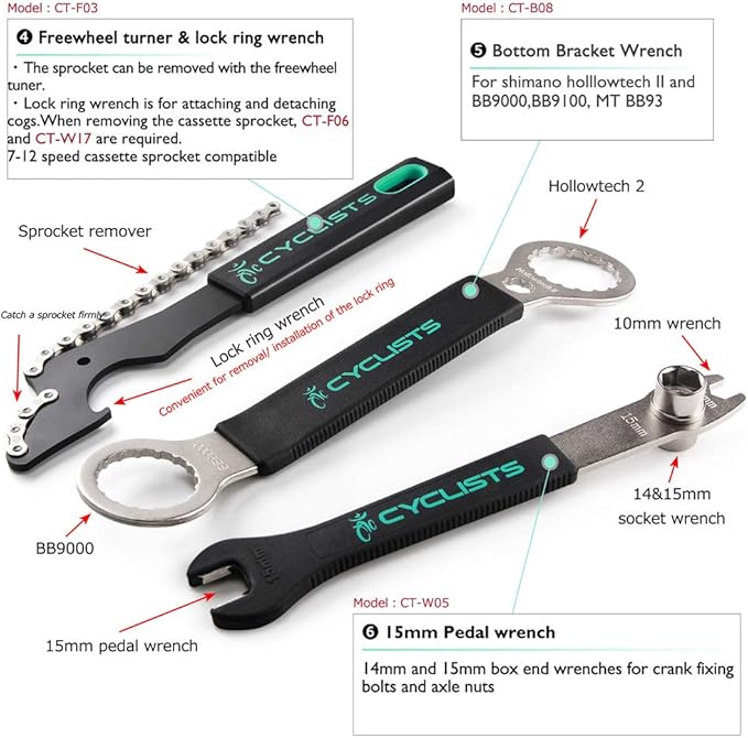 - 【Bicycle Repair Tool Kit Includes】: Chain rivet extractor, Chain ring nut wrench, Crank puller, Freewheel turner&lock ring wrench, Bottom brachet wrench, 15mm pedal wrench, Hex hey wrench(8mm), 2-in-1 master link chain pliers, Tire lever, Flat/phillip screwdriver, Flathead screwdriver, Hex key wrench set, Torx wrench, Hub spanner, Spoke wrench, Crank cap wrench, Lockring removal tool, Cartridge BB tool, Tire patch kit.
