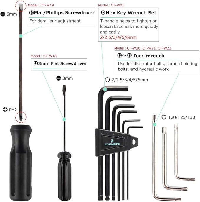 - 【Complete Bike Tool Kit】: The CYCLISTS 23 piece Bike Tool Kit contains all the tools to help you keep your bike in perfect working order, perform routine maintenance, repairs and upgrades.