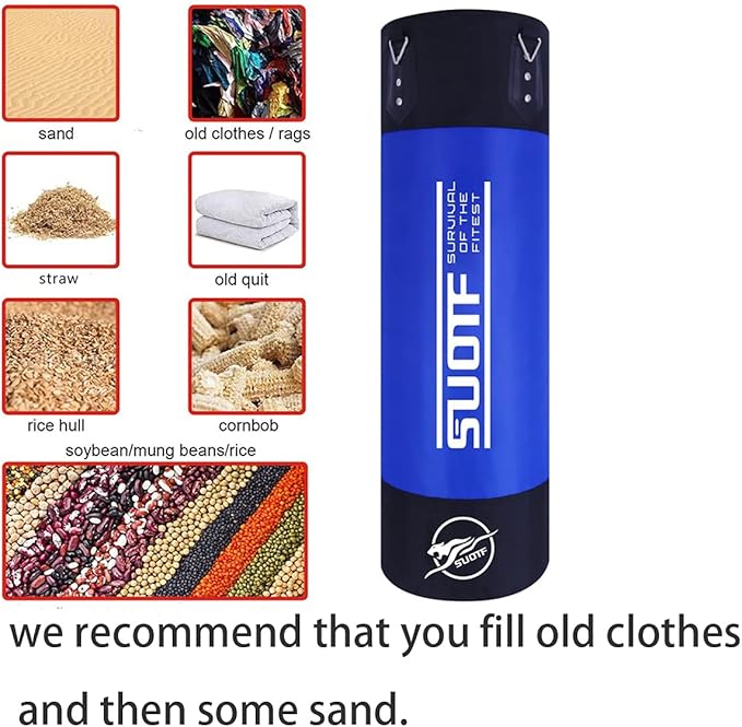 - Unfilled, this unfilled punching bag can be filled with old clothes, wood chips, sand, cotton and other waste fabrics. In order to increase the use time of boxing bag, we recommend that you fill old clothes first and then some sand.