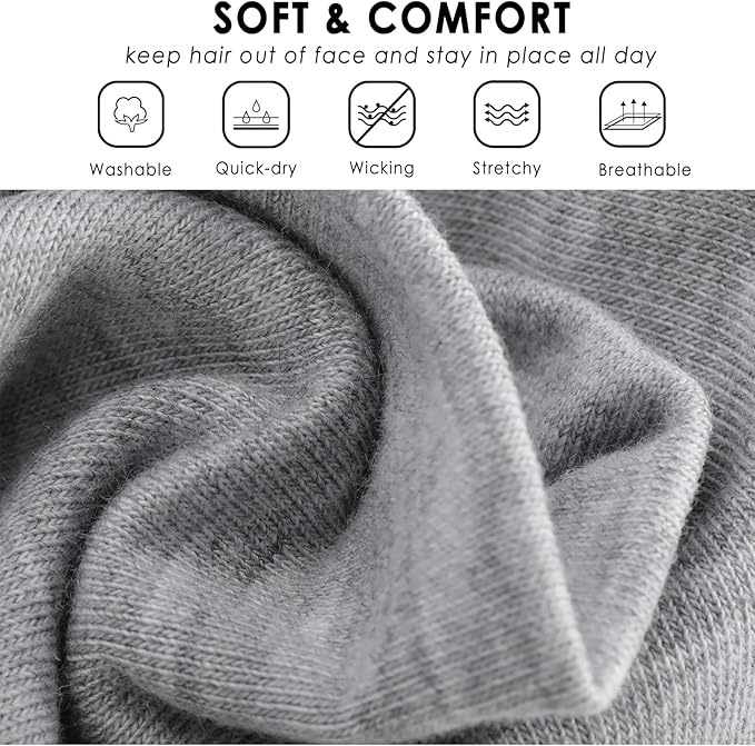 - Soft & Comfy headbands for women's hair >>>Stretchy elastic cotton-like fabric womens headbands (95% Polyester + 5% Spandex). Solid color,high stretchy, absorbent,smooth, lightweight, breathable, skin-friendly, no fading, no balls, no shrink, no hair damaged,no headache and stay dry to prevent sweat dripping on your eyes and neck during exercises.