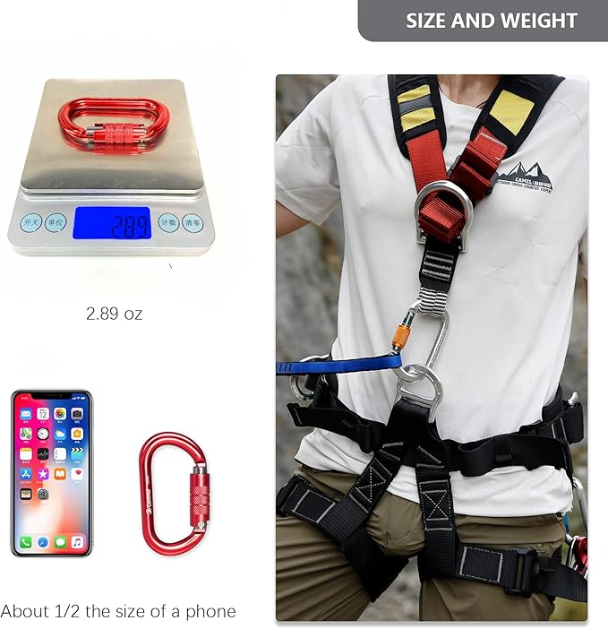 - ☪ Specification and Material ✔☪ Length: 4.3”; Width: 2.4”; Opening Gate: 0.78”;Weight 82g(2.89 ounces).Made of 7075 Aviation aluminum, whcih means compact and lightweight but DURABLE.They are widely used in many activities: climbing, tree work,expanding, exploratory caverns, downhill, rescue,aerial working, project protection hoisting, etc.