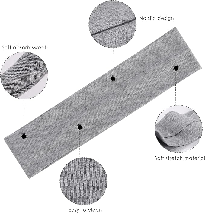 - Soft & Comfy headbands for women's hair >>>Stretchy elastic cotton-like fabric womens headbands (95% Polyester + 5% Spandex). Solid color,high stretchy, absorbent,smooth, lightweight, breathable, skin-friendly, no fading, no balls, no shrink, no hair damaged,no headache and stay dry to prevent sweat dripping on your eyes and neck during exercises.