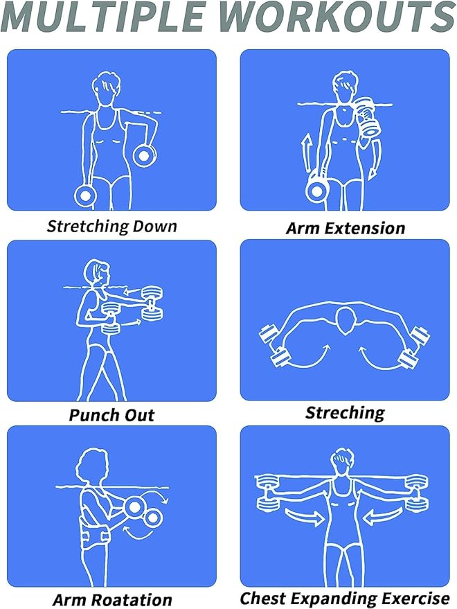 • 【Suitable for Most People】Water dumbbells are the perfect way for those who want a low-intensity workout,it allows you to build muscle or burn fat without straining your joints, whether you're doing them for rehab workouts, water yoga or swimming for beginners. It can help you get stronger and have a better body.