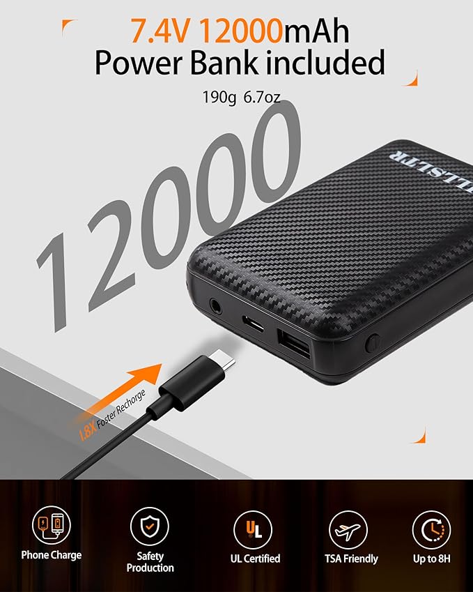 • 【12000mAh Powerbank, Up to 10 Hours Heating】 Our heated vest is powered by a brand-new 7.4V 12000mAh high-performance battery. A single charge can provide up to 10 hours of warmth, giving you long-lasting heat. Safety is a priority – our battery pack features a built-in safety protection system that prevents overcurrent and overheating, ensuring your safety at all times.