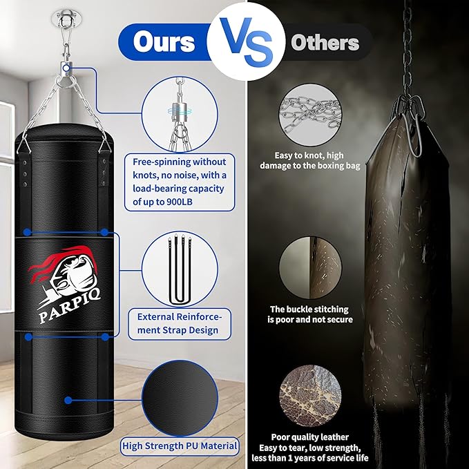 - 【Please Note】The hanging punching bag is empty, you can fill it up with sand, clothes, rags, foam, wood chips, sponge, sawdust, shredded cotton fabric and more. But note that in order to better protect the punching bag, make it more durable, do not only fill sand (filling preferably not more than 165 pounds)