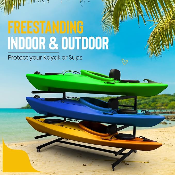 - Enhanced Stability | This freestanding kayak rack features a reinforced base for maximum stability, even on uneven surfaces. Use it confidently as a kayak rack outdoor option or as a 3 kayak storage rack for your dock or deck. Its sturdy design ensures safe storage for your gear, whether it’s a canoe, SUP, or kayak. It’s also a reliable kayak rack for garage and dock kayak rack.