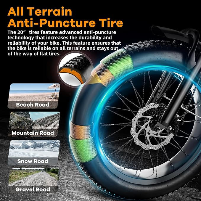 - šššš šš§š ššØš¦ššØš«šššš„š šš¢šš¢š§š : The electric bicycle adopts EABS power-off brake + front and rear double disc brakes for sensitive braking. It is designed with strong off-road performance, reliable braking force and high safety factor. High-strength shock-absorbing front fork and seatpost absorb the bumps of long, rough roads. The 20" fat tires are anti-slip and puncture-proof, ensuring you can ride like roads, snow, beaches, and rugged mountain roads.