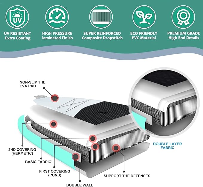 - π‘οΈMilitary-Grade Durability & Safety: Built with 0.9mm reinforced PVC and dual-layer V-drop stitch technology, the blow up paddle board withstands sharp impacts and UV exposure. The 4mm cross-vertical EVA deck delivers exceptional anti-slip performance, even during high-intensity movements. Rated for 450 lbs, it retains structural integrity under heavy loads, making it ideal for fishing, yoga, or multi-hour expeditions.