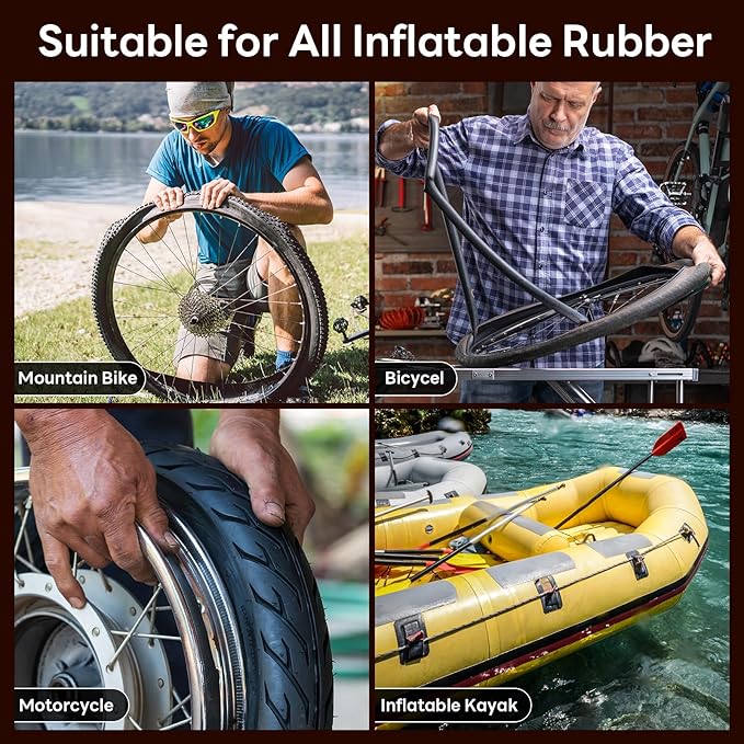 - WIDE APPLICATION: Bicycle tube tire puncture repair kit is not only suitable for road bikes, mountain bikes, scooters, motorcycles, wheelbarrows, wheelchairs and other tires that use inner tubes, but also for river, floating, rowboats, inflatable rubber. Do not attempt to repair tubeless tires with this flat tire repair kit