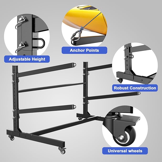 - 【Removable Wheels for Convenience】 This kayak rack has 4 lockable wheels to be able to move the until without taking everything off. So you can easily move it around anywhere you want such as garage, boat house, shed or dock.