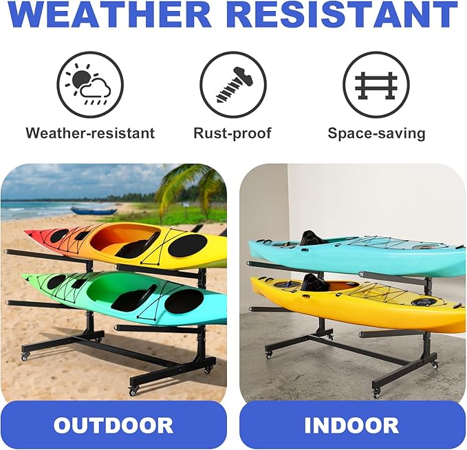 - 【Multi-Storage Space】With 2 levels of storage, the kayak stand provides plenty of room to store your kayaks, canoe, paddleboards, sup board and surfboards, or other water sports equipment. Keep your gear organized and easily accessible