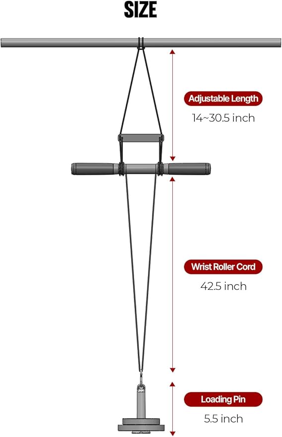 - Adjustable Length of Hanging Component: 14~30.5'', Pracord's length of Wrist Roller : 42.5'', Wrist Roller Size : 17.7'' * 1.5'' (45 * 3.8cm)