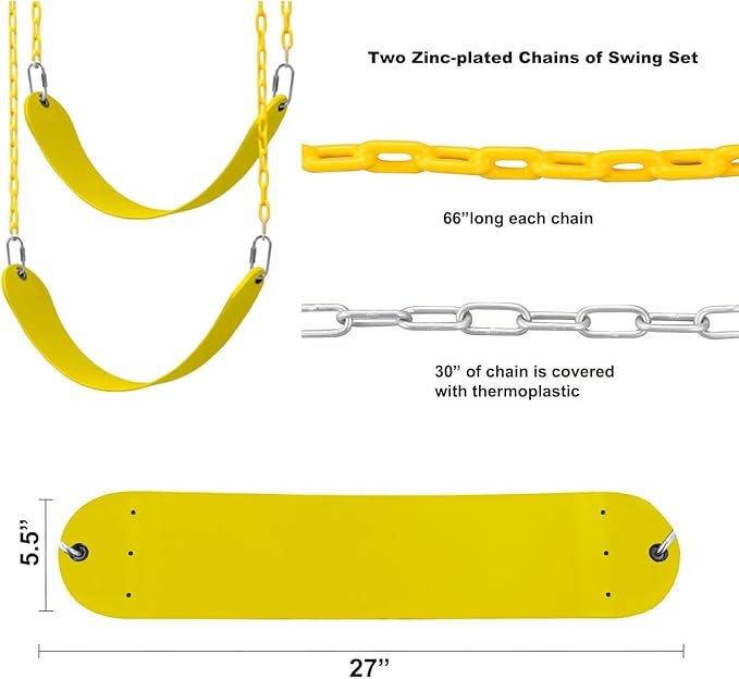 - 2.Comfortable and Safe Swing Seat :The swing seat is made of durable EVA plastic material ,which is soft and strong making you feel comfortable, extruded without deformation.The two zinc-plated chains of Swing set measure 66"" long, 30"" of which chains are covered with thermoplastic to protect users from the harm caused by the chain.The locking hooks guarantee the safety .