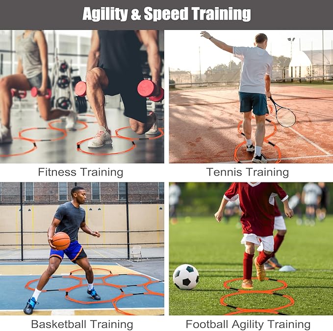 - 🏃Improve Performance and Skills. The Agility Speed Ring is training your body to perform bilateral movements that improve your speed, balance and multi-directional explosiveness, increasing acceleration, leg strength, speed, core skills, balance, cadence and body control.