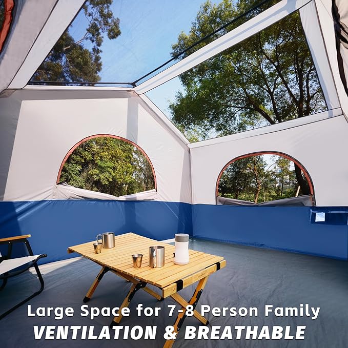 - LARGE SPACE VENTILATION & BREATHABLE: Designed with an Upgraded Ventilation System, this 8 person camping tent has 2 large mesh door, 5 mesh windows and 2 panoramic skylights, which enables fresh air and a warm breeze to come in and out easily. Meanwhile, you could also enjoy the starry sky at night with your family members while lying in the tent.